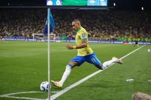 (250611) -- SAO PAULO, 11 junio, 2025 (Xinhua) -- Imagen del 10 de junio de 2025 del jugador Raphinha, de Brasil, realizando un tiro de esquina durante el partido ante Paraguay correspondiente a las Eliminatorias Sudamericanas para el Mundial de Estados Unidos, México y Canadá 2026, celebrado en el estadio Neo Química Arena, en Sao Paulo, Brasil. (Xinhua/Claudia Martini) (ra) (vf)