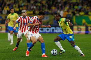 (250611) -- SAO PAULO, 11 junio, 2025 (Xinhua) -- Imagen del 10 de junio de 2025 del jugador Vinicius Júnior (d), de Brasil, controlando el balón durante el partido ante Paraguay correspondiente a las Eliminatorias Sudamericanas para el Mundial de Estados Unidos, México y Canadá 2026, celebrado en el estadio Neo Química Arena, en Sao Paulo, Brasil. (Xinhua/Claudia Martini) (ra) (vf)