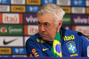 (250609) -- SAO PAULO, 9 junio, 2025 (Xinhua) -- El director técnico de la selección brasileña de fútbol, Carlo Ancelotti, reacciona durante una conferencia de prensa previa al partido de las Eliminatorias para la Copa Mundial de la FIFA 2026 ante Paraguay, en el estadio Neo Química Arena, en Sao Paulo, Brasil, el 9 de junio de 2025. (Xinhua/Claudia Martini) (cm) (rtg) (oa) (ce)