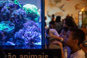 (250516) -- SAO PAULO, 16 mayo, 2025 (Xinhua) -- Imagen del 15 de mayo de 2025 de niños observando corales y peces tropicales en una exhibición de acuario en el Museo Catavento, en Sao Paulo, Brasil. (Xinhua/Wang Tiancong) (rtg) (ra) (vf)