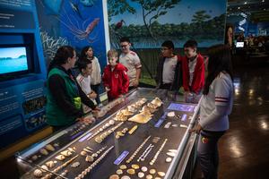 (250516) -- SAO PAULO, 16 mayo, 2025 (Xinhua) -- Imagen del 15 de mayo de 2025 de una guía dirigiendo a estudiantes a través de una muestra de conchas de mar en el Museo Catavento, en Sao Paulo, Brasil. (Xinhua/Wang Tiancong) (rtg) (ra) (vf)