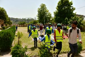 (250501) -- MUZAFFARABAD, 1 mayo, 2025 (Xinhua) -- Imagen del 30 de abril de 2025 de miembros del Departamento de Defensa Civil impartiendo un entrenamiento de primeros auxilios a alumnos de escuelas durante un simulacro de emergencia, en Muzaffarabad de Cachemira controlada por Pakistán. (Xinhua/Muhammad Din Mughal) (jg) (ah) (ce)