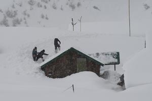 (250304) -- SONMARG, 4 marzo, 2025 (Xinhua) -- Personas quitan la nieve de una cabaña, en Sonmarg, a unos 100 kilómetros en el norte de la ciudad de Srinagar, capital de verano de Cachemira controlada por India. (Xinhua/Javed Dar) (ah) (vf)