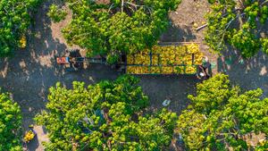 (250417) -- KAMPONG SPEU, 17 abril, 2025 (Xinhua) -- Vista aérea tomada con un dron el 18 de marzo de 2025 de trabajadores transportando mangos en un huerto de mango, en el distrito de Phnom Sruoch, en la provincia de Kampong Speu, Camboya. En el distrito de Phnom Sruoch, en el oeste de Camboya, la abundante luz solar, las lluvias abundantes y la tierra fértil proporcionan las condiciones naturales ideales para el cultivo del mango, que produce mangos de pulpa tierna y rico aroma. En la fábrica procesadora de mangos, con inversión y construida por Zhong Bao (Fujian) Food Science & Technology Co. Ltd. de China, en el distrito de Phnom Sruoch, en el oeste de Camboya, los mangos maduros se someten a procesos como lavado, pelado, rebanado, curado con azúcar y secado, transformándose finalmente en rebanadas de mango deshidratado, dulces y masticables. (Xinhua/Cheong Kam Ka) (rtg) (ra) (vf)