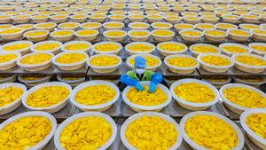 (250417) -- KAMPONG SPEU, 17 abril, 2025 (Xinhua) -- Vista aérea tomada con un dron el 18 de marzo de 2025 de un trabajador examinando la calidad de las rebanadas de mando en una fábrica de procesamiento de mango, en el distrito de Phnom Sruoch, en la provincia de Kampong Speu, Camboya. En el distrito de Phnom Sruoch, en el oeste de Camboya, la abundante luz solar, las lluvias abundantes y la tierra fértil proporcionan las condiciones naturales ideales para el cultivo del mango, que produce mangos de pulpa tierna y rico aroma. En la fábrica procesadora de mangos, con inversión y construida por Zhong Bao (Fujian) Food Science & Technology Co. Ltd. de China, en el distrito de Phnom Sruoch, en el oeste de Camboya, los mangos maduros se someten a procesos como lavado, pelado, rebanado, curado con azúcar y secado, transformándose finalmente en rebanadas de mango deshidratado, dulces y masticables. (Xinhua/Cheong Kam Ka) (rtg) (ra) (vf)