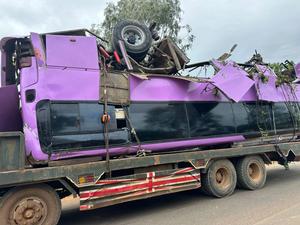 (251120) -- KAMPONG THOM, 20 noviembre, 2025 (Xinhua) -- Un camión transporta los escombros de un autobús accidentado, en la provincia de Kampong Thom, Camboya, el 20 de noviembre de 2025. Un total de 13 personas murieron y otras 24 resultaron heridas después de que un autobús chocara contra la barandilla de un puente y cayera a un río en la provincia de Kampong Thom, en el centro de Camboya, a primeras horas del jueves, según informó un oficial de policía local. (Xinhua/Policía Provincial de Kampong Thom) (rtg) (ra) (ce)