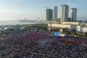 (250618) -- PHNOM PENH, 18 junio, 2025 (Xinhua) -- Vista aérea tomada con un dron de personas asistiendo a una "Marcha de Solidaridad", en Phnom Penh, Camboya, el 18 de junio de 2025. Decenas de miles de camboyanos se unieron a la marcha aquí el miércoles mientras aumentaban las tensiones fronterizas con Tailandia. (Xinhua/Kimlong Meng) (ra) (ce)