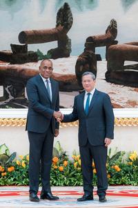 (251009) -- PHNOM PENH, 9 octubre, 2025 (Xinhua) -- El primer ministro camboyano, Hun Manet (d), estrecha la mano del visitante primer ministro dominiqués, Roosevelt Skerrit, en Phnom Penh, Camboya, el 9 de octubre de 2025. Camboya y la Mancomunidad de Dominica acordaron el jueves fortalecer y ampliar sus lazos bilaterales y su cooperación para beneficio mutuo. (Xinhua/Nitola) (jg) (ah) (ce)