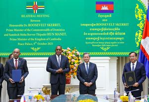 (251009) -- PHNOM PENH, 9 octubre, 2025 (Xinhua) -- El primer ministro camboyano, Hun Manet (2-d), y el visitante primer ministro dominiqués, Roosevelt Skerrit (2-i), presencian una ceremonia de firma, en Phnom Penh, Camboya, el 9 de octubre de 2025. Camboya y la Mancomunidad de Dominica acordaron el jueves fortalecer y ampliar sus lazos bilaterales y su cooperación para beneficio mutuo. (Xinhua/Nitola) (jg) (ah) (ce)