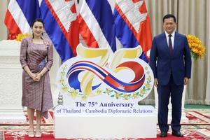 (250423) -- PHNOM PENH, 23 abril, 2025 (Xinhua) -- El primer ministro camboyano, Hun Manet (d), y la visitante primera ministra tailandesa, Paetongtarn Shinawatra, develan una placa que conmemora el 75 aniversario de relaciones diplomáticas entre los dos países, en Phnom Penh, Camboya, el 23 de abril de 2025. Camboya y Tailandia se comprometieron el miércoles a seguir mejorando las relaciones bilaterales y la cooperación en todas las áreas para beneficio mutuo. (Xinhua/Nitola) (jg) (da) (vf)
