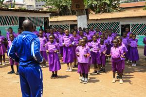 (250325) -- YAUNDE, 25 marzo, 2025 (Xinhua) -- Imagen del 17 de febrero de 2025 de Fabrice Mba, enseñando a estudiantes a practicar kung fu en el Grupo Escolar "La Petite Fontaine", en Yaundé, capital de Camerún. La pasión de Fabrice Mba por la cultura china en general y las artes marciales en particular surgió en el poblado de Sangmelima, en el sur de Camerún, donde creció viendo películas de kung fu. (Xinhua/Kepseu) (oa) (ah) (ce)