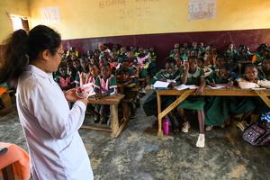 (250405) -- MBALMAYO, 5 abril, 2025 (Xinhua) -- Imagen del 3 de abril de 2025 de una médica china mostrando la forma correcta de cepillarse los dientes a estudiantes de una escuela primaria, en Mbalmayo, Camerún. Un equipo médico chino que trabaja en Camerún proporcionó el jueves servicios de atención médica gratuitos en una escuela primaria en Mbalmayo. Los servicios de atención médica gratuitos, que incluían revisiones dentales, asesoramiento de salud y una conferencia sobre prevención de enfermedades infecciosas, beneficiaron a más de 80 estudiantes y profesores de la escuela. (Xinhua/Kepseu) (oa) (da)