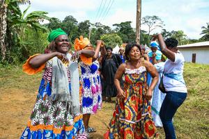 (251015) -- YAUNDE, 15 octubre, 2025 (Xinhua) -- Imagen del 8 de octubre de 2025 de aldeanos festejando tras la inauguración oficial del proyecto "Rural Solar" construido por una empresa china, en Songmimbias, en la Región Central de Camerún. A principios de octubre, varias aldeas enclavadas en las selvas tropicales de la Región Central de Camerún cobraron vida con música y baile, mientras los lugareños celebraban la inauguración oficial del proyecto "Rural Solar", construido por una empresa china. El proyecto solar tiene como objetivo proporcionar energía sin conexión a la red eléctrica a 1.000 comunidades rurales en todo Camerún. (Xinhua/Kepseu) (jg) (da) (vf)