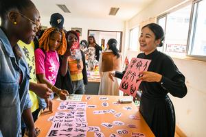(250413) -- SOA, 13 abril, 2025 (Xinhua) -- Imagen del 12 de abril de 2025 de una profesora guiando a los participantes para adivinar el significado de las escrituras de los huesos del oráculo en el Instituto Confucio de la Universidad de Yaoundé II, en Soa, Camerún. El Instituto Confucio de la Universidad de Yaoundé II organizó el sábado una vibrante feria de cultura china para conmemorar el próximo Día de la Lengua China de las Naciones Unidas, que se celebra anualmente el 20 de abril. El evento atrajo a estudiantes locales y entusiastas de la lengua con actividades de inmersión, como degustación de té chino, grabado de caligrafía, representaciones de teatro de sombras, juegos de escritura con huesos de oráculo y rompecabezas de caracteres chinos. (Xinhua/Kepseu) (oa) (ah)