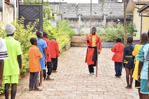 (251203) — YAUNDE, 3 diciembre, 2025 (Xinhua) — Imagen del 18 de noviembre de 2025 de Martin Mangwandjo (c), un camerunés discapacitado, dirigiendo a jóvenes estudiantes en la práctica de movimientos de artes marciales chinas en su centro de entrenamiento, en Yaundé, capital de Camerún. En un club de artes marciales del barrio Mimboman de Yaundé, decenas de estudiantes imitan los movimientos fluidos y enérgicos de su instructor, Martin Mangwandjo. El joven de 29 años se mueve con confianza y soltura, a pesar de usar muletas debido a una condición congénita. Para él, las artes marciales chinas han sido desde hace mucho tiempo más que una práctica física. (Xinhua/Kepseu) (ah) (ra) (ce)