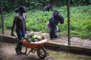 (250702) -- YAUNDÉ, 2 julio, 2025 (Xinhua) -- Imagen del 1 de julio de 2025 de un trabajador entregando alimento a los gorilas occidentales de tierras bajas en el Santuario de Primates de Mefou, en Yaundé, capital de Camerún. Ubicado en el sur de Yaundé, el Santuario de Primates de Mofu tiene como objetivo proteger a los primates mutilados o abandonados debido a la caza y el comercio ilegales. (Xinhua/Wang Guansen) (jg) (da) (vf)
