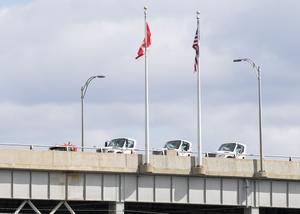 (250409) -- CATARATAS DEL NIAGARA, 9 abril, 2025 (Xinhua) -- Un transportador de automóviles que cruza el puente Lewiston-Queenston en su camino hacia Canadá, es visto desde el lado canadiense, en las Cataratas del Niágara, Ontario, Canadá, el 9 de abril de 2025. El ministro de Finanzas canadiense, François-Philippe Champagne, confirmó el martes que las nuevas contramedidas anunciadas por Canadá la semana pasada en respuesta a los aranceles estadounidenses a la industria automotriz canadiense entrarán en vigor a las 12:01 a.m. EDT del miércoles 9 de abril. (Xinhua/Zou Zheng) (oa) (ah) (ra) (ce)