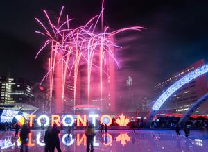 (260308) -- TORONTO, 8 marzo, 2026 (Xinhua) -- Imagen del 7 de marzo de 2026 de un espectáculo de fuegos artificiales presentado alrededor del Ayuntamiento de Toronto durante una celebración por el 192 Festival de Aniversario de la ciudad, en Toronto, Canadá. (Xinhua/Zou Zheng) (rtg) (ah)