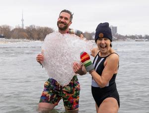 (260102) -- TORONTO, 2 enero, 2026 (Xinhua) -- Imagen del 1 de enero de 2026 de participantes posando para fotografías con un trozo de hielo flotante en el lago Ontario durante el evento Baño de Oso Polar de Toronto, en Toronto, Canadá. Cientos de personas desafiaron las frías aguas aquí el jueves para celebrar el primer día de 2026 y recaudar fondos para caridad. (Xinhua/Zou Zheng) (oa) (ra) (vf)