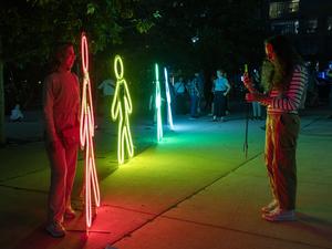 (251005) -- TORONTO, 5 octubre, 2025 (Xinhua) -- Imagen del 4 de octubre de 2025 de una mujer (i) posando para una fotografía junto a la instalación artística "Signals of the City: Crossing Paths" durante el evento Nuit Blanche 2025, en Toronto, Canadá. El festival anual de arte, que dura toda la noche, comenzó aquí el sábado y exhibe más de 85 obras de arte contemporáneo de artistas locales, nacionales e internacionales en espacios públicos. (Xinhua/Zou Zheng) (oa) (ah)