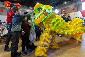 (250127) — TORONTO, 27 enero, 2025 (Xinhua) — Imagen del 26 de enero de 2025 de niños interactuando con bailarines de la danza del león en celebración de la próxima Fiesta de la Primavera, o Año Nuevo Lunar chino, en el Centro Cultural Chino del Gran Toronto, en Toronto, Canadá. (Xinhua/Zou Zheng) (oa) (ah) (ce)