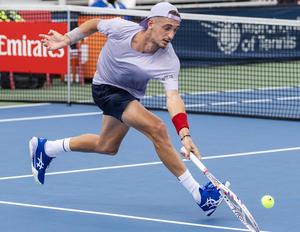 (250727) -- TORONTO, 27 julio, 2025 (Xinhua) -- Imagen del 26 de julio de 2025 de Terence Atmane, de Francia, devolviendo la pelota durante el partido de clasificación de individuales masculino entre Terence Atmane, de Francia y Facundo Bagnis, de Argentina, en el torneo de tenis Abierto National Bank 2025, en Toronto, Canadá. (Xinhua/Zou Zheng) (oa) (da)