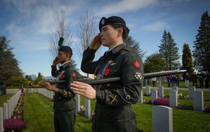 (250406) -- VANCOUVER, 6 abril, 2025 (Xinhua) -- Imagen del 5 de abril de 2025 de cadetes del Ejército saludando durante la ceremonia por el Día de la Cresta de Vimy, en el Cementerio de Mountain View, en Vancouver, Columbia Británica, Canadá. Cerca de 300 cadetes del Ejército, veteranos y funcionarios de Gobierno participaron en una ceremonia el sábado previo al Día de la Cresta de Vimy para honrar a los soldados canadienses que pelearon en la Batalla de la Cresta de Vimy de cuatro días de duración durante la Primera Guerra Mundial. El día se celebra anualmente el 9 de abril y también se conoce como el Día Nacional del Recuerdo de la Batalla de la Cresta de Vimy. (Xinhua/Liang Sen) (rtg) (ah)
