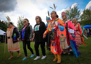 (250512) -- VANCOUVER, 12 mayo, 2025 (Xinhua) -- Imagen del 11 de mayo de 2025 de mujeres tomadas de las manos durante la Gran Entrada en el Powwow Tradicional del Día de la Madre, en Vancouver, Columbia Británica, Canadá. Cientos de indígenas de varias tribus de Canadá se reunieron el domingo para celebrar el Día de la Madre con un powwow, una reunión social tradicional con música y danza. (Xinhua/Liang Sen) (oa) (ah) (ce)