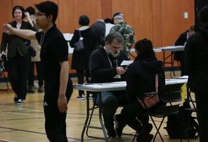 (250428) -- VANCOUVER, 28 abril, 2025 (Xinhua) -- Un hombre se registra en un colegio electoral, en Vancouver, Columbia Británica, Canadá, el 28 de abril de 2025. Millones de canadienses se forman para emitir sus votos el lunes mientras el presidente estadounidense, Donald Trump, intervino en las elecciones con una nueva amenaza de anexión del país. (Xinhua/Liang Sen) (oa) (ah) (ce)