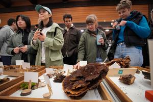 (251027) -- VANCOUVER, 27 octubre, 2025 (Xinhua) -- Imagen del 26 de octubre de 2025 de personas observando setas exhibidas en una exposición anual de setas, en Vancouver, Columbia Británica, Canadá. Con más de 300 setas y hongos identificados, el evento también incluyó talleres de identificación y cultivo de especímenes para promover la comprensión pública de la biodiversidad y la conservación de los hongos. (Xinhua/Liang Sen) (oa) (ah) (ce)