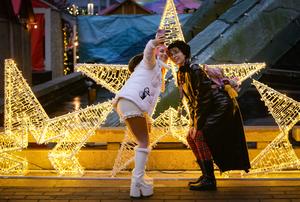 (251115) — VANCOUVER, 15 noviembre, 2025 (Xinhua) — Imagen del 14 de noviembre de 2025 de visitantes posando para fotografías con las instalaciones de luz en el Mercado Navideño de Vancouver, en Vancouver, Columbia Británica, Canadá. El evento festivo anual cuenta con más de 110 cabañas de madera que ofrecen diversas artesanías, comida tradicional europea, bebidas y recuerdos, junto con presentaciones en vivo. El mercado de este año abrió sus puertas aquí el jueves y estará abierto hasta el 24 de diciembre. (Xinhua/Liang Sen) (jg) (da)