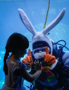 (250413) -- VANCOUVER, 13 abril, 2025 (Xinhua) -- Imagen del 12 de abril de 2025 de un buzo vestido como el Conejo de Pascua interactuando con una niña a través del vidrio de un tanque gigante, como parte de las celebraciones de Pascua en el Acuario de Vancouver, en Vancouver, Columbia Británica, Canadá. (Xinhua/Liang Sen/Xinhua) (oa) (da)
