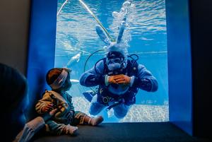 (250413) — VANCOUVER, 13 abril, 2025 (Xinhua) — Imagen del 12 de abril de 2025 de un buzo vestido como el Conejo de Pascua interactuando con una bebé a través del vidrio de un tanque gigante, como parte de las celebraciones de Pascua en el Acuario de Vancouver, en Vancouver, Columbia Británica, Canadá. (Xinhua/Liang Sen/Xinhua) (oa) (da)