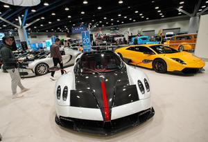 (250320) -- VANCOUVER, 20 marzo, 2025 (Xinhua) -- Imagen del 19 de marzo de 2025 de visitantes observando un Pagani Huayra Roadster durante el Salón del Automóvil de Vancouver 2025 en el Centro de Convenciones de Vancouver, en Vancouver, Columbia Británica, Canadá. Presentando un diverso rango de vehículos, desde superautomóviles de lujo hasta modelos amigables con el medio ambiente eléctricos e híbridos, el salón del automóvil anual de cinco días de duración comenzó aquí el miércoles. (Xinhua/Liang Sen) (rtg) (ra) (vf)