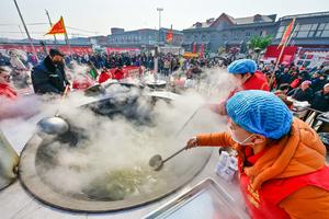 (260213) — BEIJING, 13 febrero, 2026 (Xinhua) — Imagen del 10 de febrero de 2026 de trabajadores cocinando dumplings con un wok gigante en un mercado, en Tianjin, en el norte de China. Los mercados de todo el país están muy activos estos días ya que las personas acuden allí para abastecerse de productos en preparación para el próximo Festival de la Primavera o el Año Nuevo chino. (Xinhua/Du Penghui) (rtg) (ra)