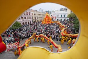 (260217) — MACAO, 17 febrero, 2026 (Xinhua) — Artistas realizan una presentación de la danza del dragón en celebración por la Fiesta de la Primavera, en Macao, en el sur de China, el 17 de febrero de 2026. (Xinhua/Cheong Kam Ka) (oa) (ah) (vf)