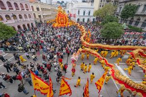 (260218) — MACAO, 18 febrero, 2026 (Xinhua) — Bailarines de la danza del dragón realizan una presentación durante una celebración de la Fiesta de la Primavera frente a las Ruinas de San Pablo, en Macao, en el sur de China, el 18 de febrero de 2026. (Xinhua/Cheong Kam Ka) (jg) (da) (ce)