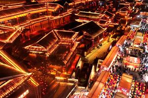 (260213) — BEIJING, 13 febrero, 2026 (Xinhua) — Vista aérea tomada con un dron el 12 de febrero de 2026 de turistas observando linternas e instalaciones de luz en una área escénica, en Luoyang, en la provincia de Henan, en el centro de China. Varios eventos festivos se llevan a cabo en toda China para celebrar el próximo Año Nuevo chino del Caballo. (Xinhua/Zhang Yixi) (oa) (ra) (vf)