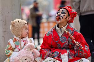(260219) — BEIJING, 19 febrero, 2026 (Xinhua) — Imagen del 18 de febrero de 2026 de una niña interactuando con un actor en un espectáculo de cultura folclórica, en Lanzhou, en la provincia de Gansu, en el noroeste de China. Durante la Fiesta de la Primavera, varias actividades folclóricas y presentaciones se llevan a cabo a través de China. (Xinhua/Hou Chonghui) (rtg) (ra) (vf)