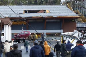 (250526) -- PUERTO VARAS, 26 mayo, 2025 (Xinhua) -- Imagen del 25 de mayo de 2025 de personas reaccionando frente a una vivienda dañada después del paso de un tornado, en la ciudad de Puerto Varas, provincia de Llanquihue, en la Región de Los Lagos, en el sur de Chile. Varias personas resultaron heridas y un centenar de viviendas con daños, además de postes eléctricos y árboles caídos, como resultado de un tornado en la ciudad de Puerto Varas, en la región de Los Lagos de Chile, informó la Dirección Meteorológica. (Xinhua/Str) (jv) (rtg) (ah) (vf)