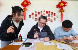 (260421) -- PUNTA ARENAS, 21 abril, 2026 (Xinhua) -- Imagen del 20 de abril de 2026 de personas practicando caligrafía china en un evento por el Día Internacional de la Lengua China en el Instituto Confucio de la Universidad de Magallanes, en Punta Arenas, Chile. (Xinhua/Zhou Jiayi) (oa) (ah) (vf)