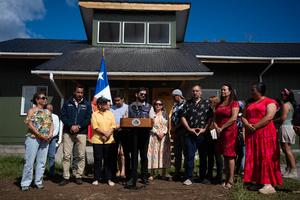 (260220) -- RAPA NUI, 20 febrero, 2026 (Xinhua) -- Imagen cedida por la Presidencia de Chile del presidente chileno, Gabriel Boric (c), hablando durante un encuentro con habitantes beneficiados por el Programa de Habitabilidad Rural, en la Isla de Rapa Nui, Chile, el 20 de febrero de 2026. Estados Unidos "amenaza" y aplica "sanciones unilaterales", afirmó el viernes Boric en respuesta a la acusación de Washington de que el país austral socava la seguridad regional y a la aplicación de restricciones de visas a tres funcionarios del Gobierno chileno. (Xinhua/Presidencia de Chile) (da) (vf)