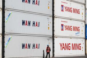 (251119) -- SAN ANTONIO, 19 noviembre, 2025 (Xinhua) -- Imagen del 18 de noviembre de 2025 de un trabajador portuario caminando frente a contenedores durante la ceremonia de lanzamiento de la temporada de exportación de cerezas 2025-2026 en las dependencias de San Antonio Terminal Internacional, en el puerto de San Antonio, en la región de Valparaíso, Chile. Chile comenzó esta semana la temporada de exportación de cerezas frescas 2025-2026 por vía marítima, con barcos de ruta directa hacia China para abastecer al mercado asiático en su temporada invernal. (Xinhua/Jorge Villegas) (jv) (jg) (da) (ce)