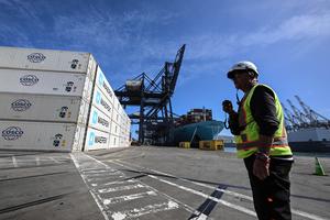 (251119) -- SAN ANTONIO, 19 noviembre, 2025 (Xinhua) -- Imagen del 18 de noviembre de 2025 de un trabajador portuario laborando frente a un buque cargado con contenedores durante la ceremonia de lanzamiento de la temporada de exportación de cerezas 2025-2026 en las dependencias de San Antonio Terminal Internacional, en el puerto de San Antonio, en la región de Valparaíso, Chile. Chile comenzó esta semana la temporada de exportación de cerezas frescas 2025-2026 por vía marítima, con barcos de ruta directa hacia China para abastecer al mercado asiático en su temporada invernal. (Xinhua/Jorge Villegas) (jv) (jg) (da) (ce)
