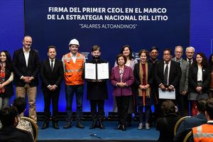 (250906) — SANTIAGO, 6 septiembre, 2025 (Xinhua) — Imagen del 5 de septiembre de 2025 del presidente chileno, Gabriel Boric (5-i), participando en la firma del primer Contrato Especial de Operación de Litio (CEOL) con la Empresa Nacional de Minería (Enami) para el proyecto Salares Altoandinos, en el Palacio de La Moneda, en Santiago, capital de Chile. Chile firmó el viernes el primer CEOL con Enami que permitirá la explotación del proyecto Salares Altoandinos, en la región de Atacama, uno de los más importantes en América Latina. (Xinhua/Jorge Villegas) (jv) (oa) (da)