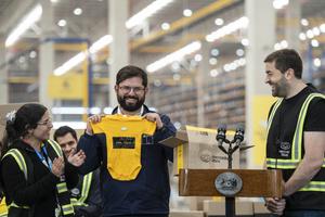 (250409) -- SANTIAGO, 9 abril, 2025 (Xinhua) -- Imagen cedida por la Presidencia de Chile del presidente chileno, Gabriel Boric (c), sosteniendo ropa para bebé durante su visita al Centro de Distribución y Almacenamiento de Mercado Libre, en Colina, en el norte de la región Metropolitana de Santiago, capital de Chile, el 9 de abril de 2025. La multinacional argentina Mercado Libre anunció el miércoles que inyectará más de 550 millones de dólares este 2025 en el marco del Plan de Aporte Económico, un 18 por ciento más que el año anterior, con el fin de potenciar el comercio electrónico y sus servicios financieros, entre otros fines. (Xinhua/Presidencia de Chile) (ra) (ah) (ce)