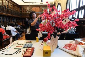 (250122) -- SANTIAGO, 22 enero, 2025 (Xinhua) -- Imagen del 21 de enero de 2025 de la directora de la Biblioteca Nacional, Soledad Abarca de la Fuente, depositando una tarjeta en el árbol de los deseos durante un acto cultural de celebración con motivo del reconocimiento de la Fiesta de la Primavera como Patrimonio Inmaterial de la Humanidad en el edificio de la Biblioteca Nacional, en Santiago, capital de Chile. Chile y China festejaron el martes el reconocimiento de la Fiesta de la Primavera, que engloba las prácticas sociales del pueblo chino en la celebración del Año Nuevo lunar, en la lista del Patrimonio Cultural Inmaterial de la Humanidad por la Organización de las Naciones Unidas para la Educación, la Ciencia y la Cultura (Unesco), que pone en valor la cultura china en todo el mundo. (Xinhua/Jorge Villegas) (jv) (jg) (da) (vf)