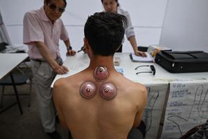 (260126) -- SANTIAGO, 26 enero, 2026 (Xinhua) -- Imagen del 25 de enero de 2026 de un hombre recibiendo un tratamiento de Medicina Tradicional China en un estand en el marco del Año Nuevo Lunar Chino 2026 en el parque O'Higgins, en Santiago, capital de Chile. Miles de chilenos y la comunidad china se llenaron de júbilo el domingo con la celebración del Año Nuevo Chino 2026 en el parque O'Higgins, el pulmón verde de la capital del país sudamericano, que alojó diversas expresiones artísticas, culturales y amistosos intercambios entre ambas comunidades en el marco de esta actividad Patrimonio Cultural Inmaterial de la Humanidad por la Organización de las Naciones Unidas para la Educación, la Ciencia y la Cultura. (Xinhua/Jorge Villegas) (jv) (oa) (ah) (vf)