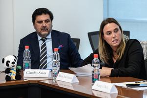(250510) — SANTIAGO, 10 mayo, 2025 (Xinhua) — Imagen del 9 de mayo de 2025 de la gerenta comercial en Chile del distribuidor chino de frutas «Joy Wing Mau», María José García (d), participando durante la reunión informativa sobre la nueva edición de la VIII Exposición Internacional de Importaciones de China (CIIE, por sus siglas en inglés) en la sede del Banco de China, en Santiago, capital de Chile. La VIII CIIE, que se realizará en Shanghai del 5 al 10 de noviembre de este año, ofrece oportunidades de comercio a las empresas chilenas en un contexto internacional desafiante e incierto, según trascendió en un evento de promoción de la feria. (Xinhua/Jorge Villegas) (jv) (jg) (da)