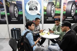 (250908) -- SANTIAGO, 8 septiembre, 2025 (Xinhua) -- Personas visitan el estand de una marca china de llantas durante la inauguración de la Expo Industrial Internacional Chile 2025, en Santiago, capital de Chile, el 8 de septiembre de 2025. (Xinhua/Jorge Villegas) (jv) (rtg) (ah) (ce)